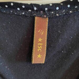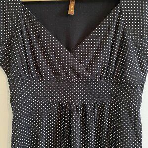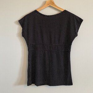 Babydoll t-shirt blouse. Dainty, trendy, black and white polka dot pattern. Short, tight fitting cap sleeves. Babydoll silhouette with cinched empire waist panel, flowing A-line silhouette with some pleating. Crossover v-neck. Y2K, coquette, balletcore.