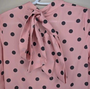 Polka Dot Dress Ascot Neck Tie Bow Pink Black Full Button Down Midi Length Small