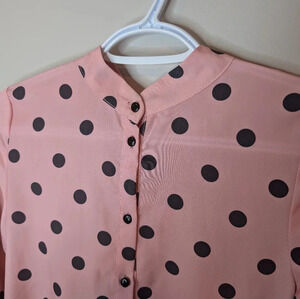 The classic black and pink polka dot pattern adds a touch of timeless elegance, while the ascot neck tie, long sleeves and full button-down front offer a sophisticated look.