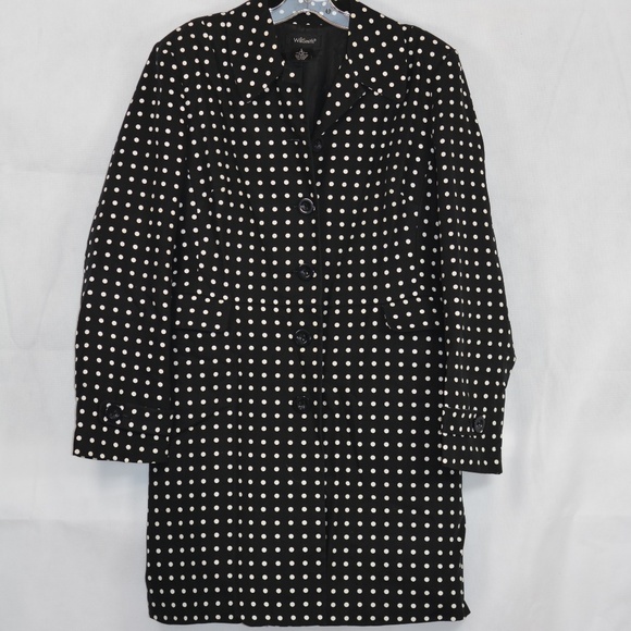 Love a polkadot coat! This is more the length of a coat rather than a jacket. Black and white polkadots! SZ L by Willi Smith.