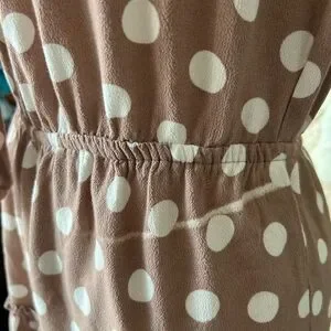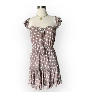 Chic and playful, this polka dot ruffle dress is perfect for any occasion. The brown and white color combination adds a classic touch.