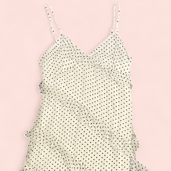 Chic polka dot dress with ruffle details. Perfect for any occasion.
