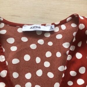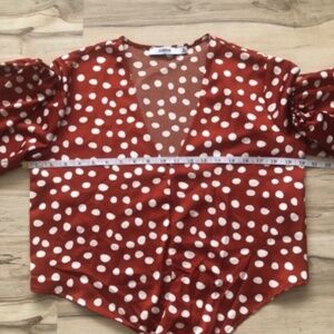 Chic and stylish, this polka dot tie-front blouse is perfect for any occasion. The vibrant red color adds a pop of color to your wardrobe. Pair it with your favorite jeans or skirt for a complete look.