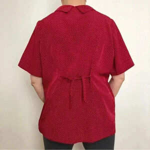 Lovely A line blouse with a front pleat featuring V neck, pointed collar, and adjusting strap in the back. Satiny fabric in wine colour with tiny polka dots. Loose fit.