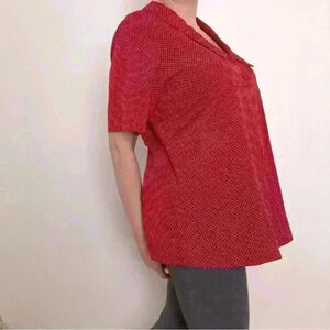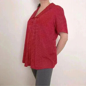 Lovely A line blouse with a front pleat featuring V neck, pointed collar, and adjusting strap in the back. Satiny fabric in wine colour with tiny polka dots. Loose fit.