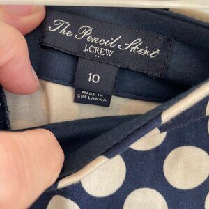 Adorable and flattering polka dot J Crew pencil cotton skirt. It has a kick pleat in the back and is in great condition.The background is a navy blue with cream colored dots
