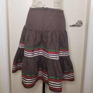 Chocolate brown midi length tiered peasant circle skirt with white polka dot heart print and ornate colourful horizontal scallop ribbon stripes, by PM Tenore for RVCA Clothing.