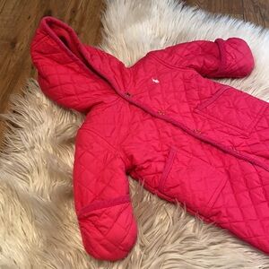Fantastic like new condition baby snow suit / bunting suit. Fleece lined throughout with fold over mitts. Diamond quilted exterior with two pockets and hood.