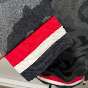 Black camo pattern with black white and red stripes ribbed hem and sleeve cuffs. Drawstring hood. Kangaroo pouch front pockets. Soft cotton blend. Letter P patch on chest.