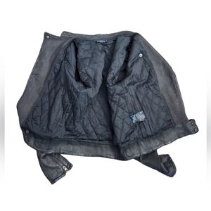 Asymmetrical front zip, quilted lining, adjustable waist buckles, and multiple zippered pockets. 98% cotton / 2% elastane shell with 100% cotton lining and polyester fill. Some pilling on the lining (pictured), otherwise in great condition.