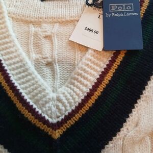đź’Ąđź’ĄPolo Ralph Lauren Cream Cable Knit Sweater with Striped V-Neck Wimbledonđź’Ąđź’Ą