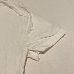 This shirt is a fitted small. It is pre-owned and in used condition. It has wrinkled due to storage. Please see all photos for exact item.