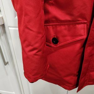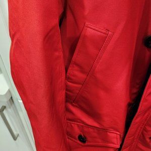 Drawstring hood with a buckled tab at the back and snap-off faux-fur trim.