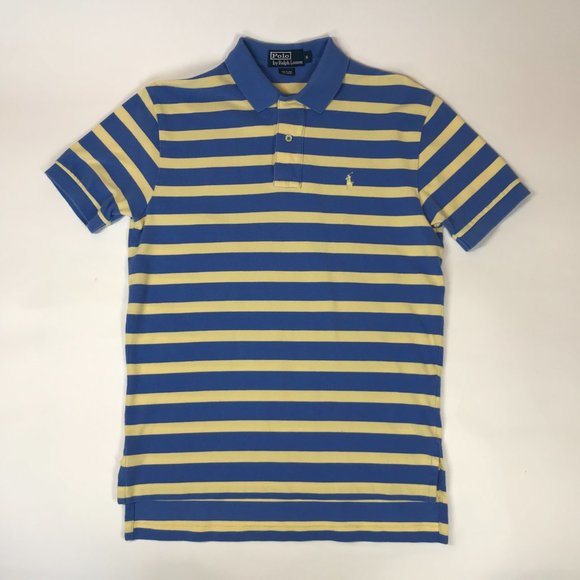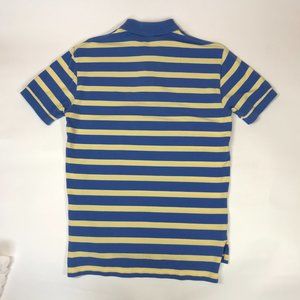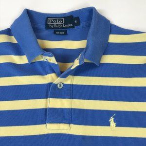 Great for spring and golf weather, this Polo Ralph Lauren short sleeved shirt features 2 buttons, split open hem for easy tucking, in a soft pique cotton blue and yellow stripe. Mens sz SM. In very good gently used condition with no rips or stains.
