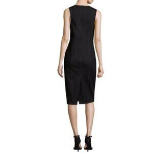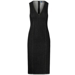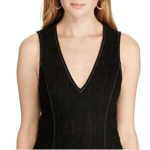 Polo Ralph Lauren sleeveless sheath dress in black stretch denim with contrast stitching. Features a V-neckline, princess seams, and back vent for a flattering fit. Concealed back zipper. Made of 98% cotton and 2% elastane for comfort and stretch.