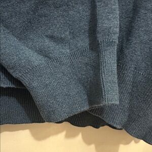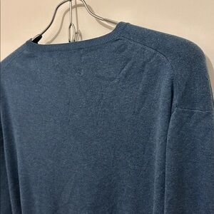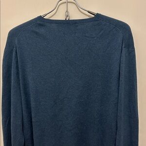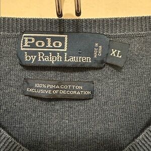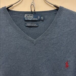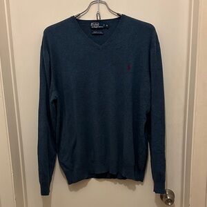 A beautiful shade of light cobalt blue from Ralph Lauren in a Pima cotton V-neck. Excellent condition all around. No rips, no holes, no tears. No stains or fading. The cuffs are still tight as is the waist and there is no stretching at stress points such as the elbows. This is a lightweight pullover that will go with a lot of items that are undoubtedly already in your wardrobe.