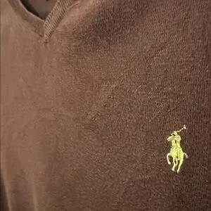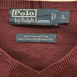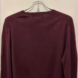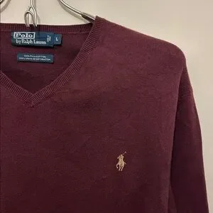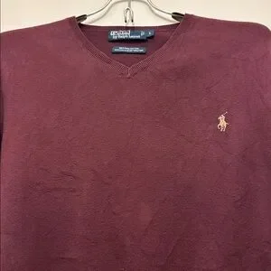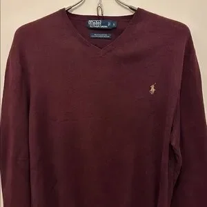 A V-neck pullover in Pima cotton from Ralph Lauren. It’s a wine coloured shade of purple that’s not quite dark enough to be burgundy. It’s in fantastic condition as is every item that I offer for sale from my closet. I’m fastidious about the condition of clothing that I offer. No holes no tears no rips. No stains no fading. The cuffs and the waistband are not stretched out. Perfect for the office on a cool fall day, worn over a button down oxford and a crisp blazer.