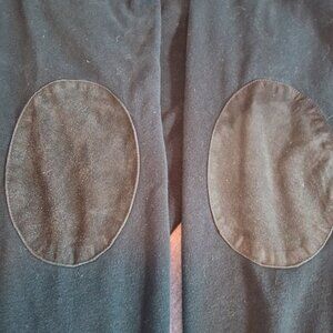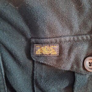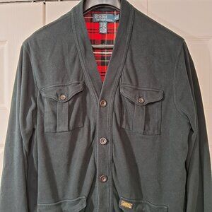 Polo Ralph Lauren men's navy cotton cardigan with red tartan interior. Multiple pockets. Suede elbow patch.