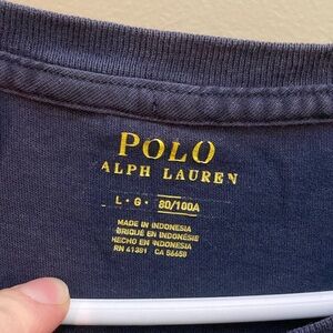 This Polo by Ralph Lauren short sleeve tee features a classic navy blue color and a comfortable crew neck design. The shirt is made from soft cotton material and showcases a small red embroidered logo on the left chest, adding a subtle touch of style.