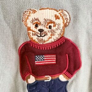 Classic gray crewneck sweater. Features iconic bear motif with American flag sweater. Perfect for casual wear. Vintage Style Polo Ralph Lauren Bear Wool Blend Crewneck - Grey Women's XL American Flag Bear Pullover Sweater - Embroidered Knit