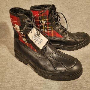 Polo by Ralph Lauren Udel duck boots. Leather uppers with tartan plaid panels, leather laces, rubber soles. Shearling lined. New, with tags, no box.