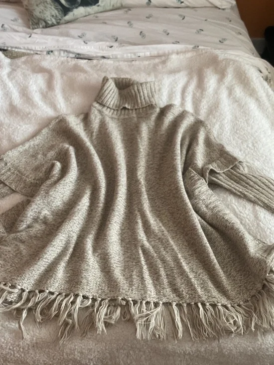 Poncho with sleeves and turtle neck sides are open . I’ve worn this with a belt just in the front part or vice versa or front and back. Very sweet piece almost boho style if you like. It’s a small very oversized. I have 3 of these love them always get compliments hard to find in this style.