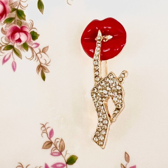 A fun pop art brooch of an enameled shushing finger and enameled red lips! Set on gold-tone metal.