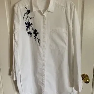 The tunic falls to just above the knee and has side slits for easy movement. It is a shirt front with covered buttons, front pocket and embroidered flower motif. Worn with a pair of skinny jeans. No rips, stains or tears. Good condition!