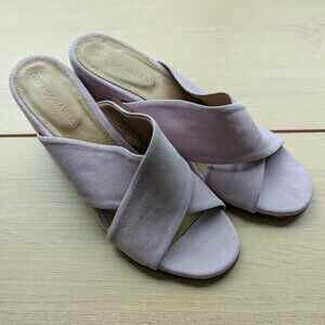 Indulge in sustainable luxury with these gorgeous Poppy Barley mule sandals in a dreamy pale lilac pinky-purple leather. Crafted from premium, buttery-soft leather, these sophisticated slides feature a minimalist crossover strap design that effortlessly elevates any outfit. The substantial block heel provides excellent stability while adding a modern architectural element to these Canadian-made beauties.