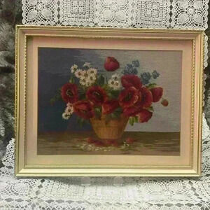 Poppy Daisy Bachelor Button NeedlePoint Floral Still Life Vtg MCM Framed 11x14