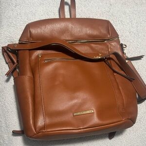 Elegant chestnut backpack with sleek design. Features front zipper pocket and side compartments. Ideal for daily use.