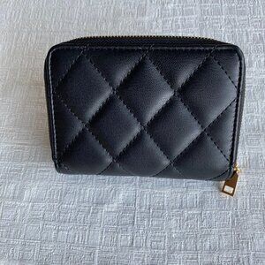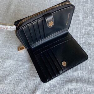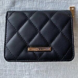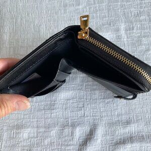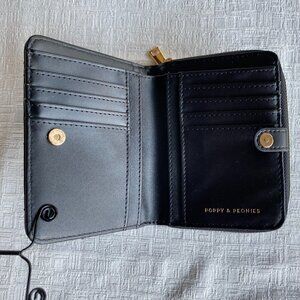 Poppy & Peonies Quilted Black Compact Vegan Leather Wallet. Features: zip around coin pocket, magnetic snap closure front side, opens to 7 card slots, 4 slip pockets, paper currency compartment, backside slip pocket. Gold tone hardware, logo applique on front. In excellent preowned condition, no signs of wear.