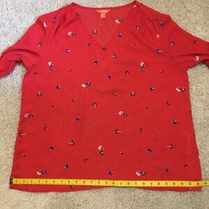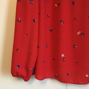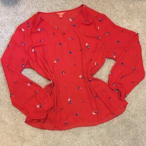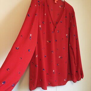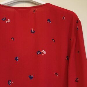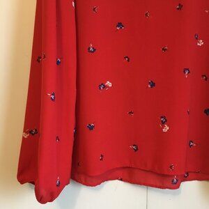 Very good preowned condition sheer, single button closure, poppy red blouse by Joe Fresh. Very nice for Joe Fresh. They do produce some nice things. Hangs beautifuly and features tiny little sparks of flower in dark blue and white.