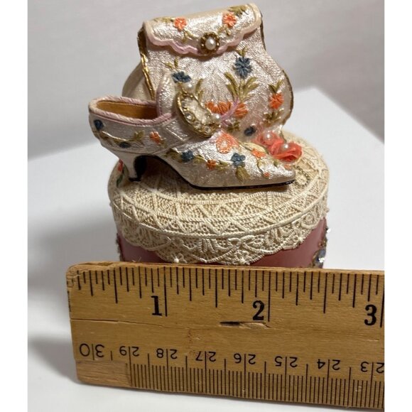 This intricately designed trinket box features a Victorian-style shoe and purse figurine, adorned with colorful floral embroidery. Crafted with attention to detail, it adds a touch of elegance to any space. The box itself is embellished with lace and floral decorations, making it a beautiful decorative piece and storage solution.
