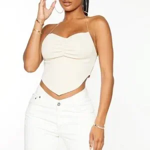 stone soft rib material with a ruched front design, halterneck design and a cropped length. Team this with jeans and fresh kicks to complete the look.