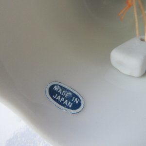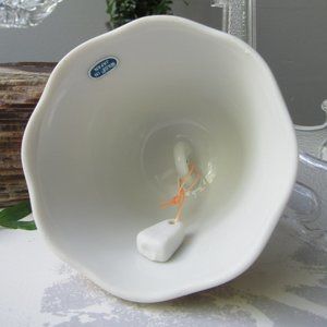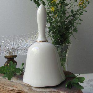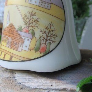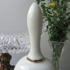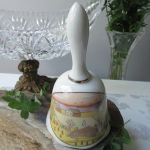 Vintage porcelain bell with rustic pastel colors. The handle of the bell is decorated with a golden rim, the edge of the bell is ribbed.