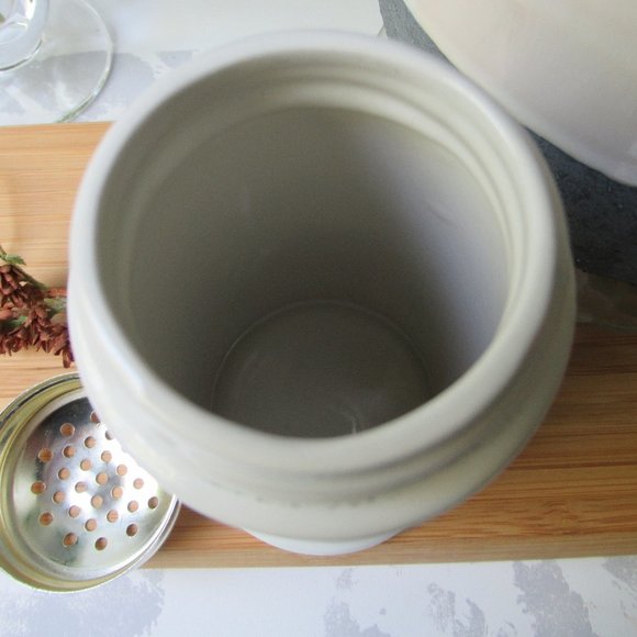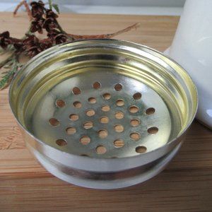 Description. Vintage porcelain cheese shaker with metal screw cap.