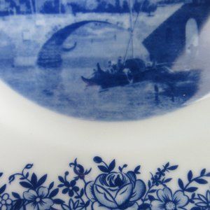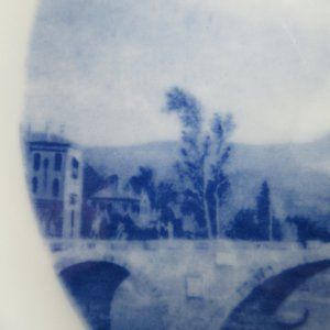 Description. Vintage decorative plate with a landscape in blue and white colors. There is a floral ornament on the edges.