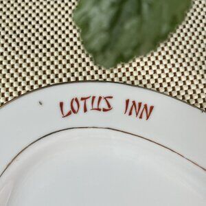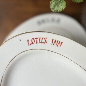 The dish has a classic oval shape and is decorated around the edges with an image of a pink lotus, the inscription "Lotus Inn" and hieroglyphs. The rim of the plate is framed by two thin gold borders.