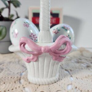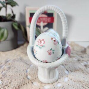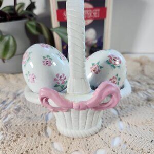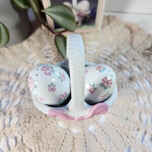 Porcelain Salt and Pepper Set Eggs in a Basket Roses & Ribbon Three Piece in Box