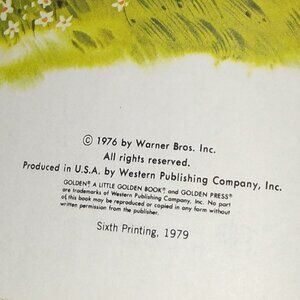 This hardcover classic kids book from the A little Golden Book collection: Porky Pig and Bugs Bunny from 1976 is in great shape for it's age except for some wear along the outer spine and the edges of the book, and some wrinkling in the book on some of the pages in the book and some sticker scum on the top of the front page. It is sold as is.