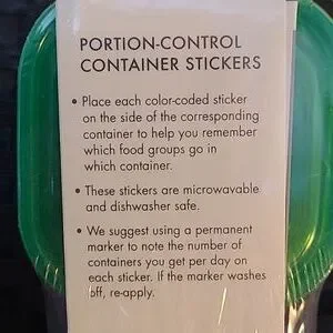 I have portion control Containers from the Portion Control fix. Portions for Red- proteins, Yellow- Carbs, Blue- dairy, orange seeds/oils, Purple- fruit and Green- non-starchy veggies.