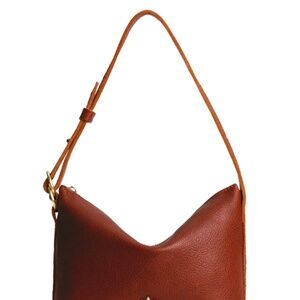 Rich pebbled leather in Nutmeg colour. This is the large slouchy and measurements are included in the photos. No inside or outside pockets. Shoulder strap is thick and very comfortable.