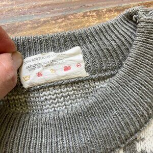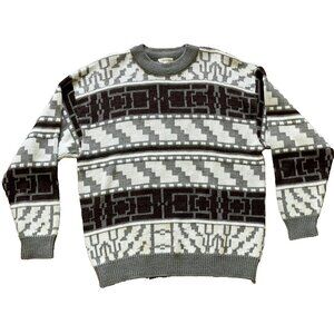 Vintage Porto Bello knit pullover sweater has geometric design in white/grey/brown colors. (Note that the dark color is dark brown, not black). 100% acrylic for easy wash/wear. Tag doesn't list size - fits like an adult large - see below for garment measurements. Pre-owned condition, knit fabric has some pilling as is typical in a knit garment.
