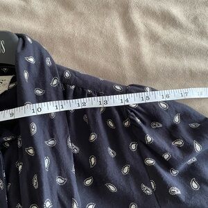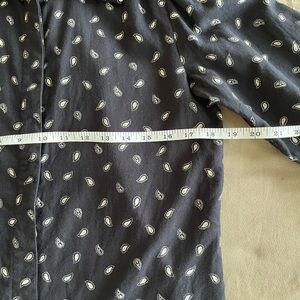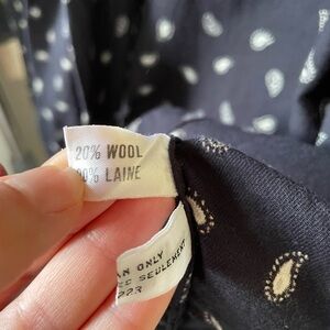Features: long sleeve, tie neckline, full button closure, subtle gathering at shoulders, paisley print, 80% cotton, 20% wool, soft, cozy