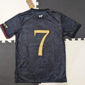 A timeless black and gold replica jersey honoring Portugal's Number 7. It features Portugal's shield, a tribute to his club journey, and a floral pattern inspired by Madeira, celebrating the legendary career of The Siu.