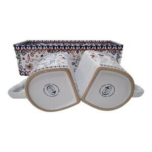 Portuguese "Love Handkerchief" Design Twin Mugs Set of 2 In Matching Gift Box - Never Used - Gift for Lover or Friend: This is a gift set of two colorful and unusual mugs from Portugal - new in a matching gift box. They are 3.5 inches tall and 5.5 inches wide including the heart-shaped handles. The copyrights are "Gift Souvenirs Portugal" and marked "Authentic Design". They are designed to nest together along the ribbed sides. (The box was wrapped in clear plastic but I had to remove it to photograph.) Please read the history of these unique items as follows: