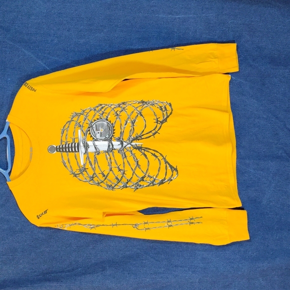 Show off your tough interior with the Post Malone Rib Cage Yellow Long Sleeve T-Shirt. This 100% cotton and all yellow shirt features images on the front, back and arms of the human anatomy made up of barbed wire, swords and saw blades.