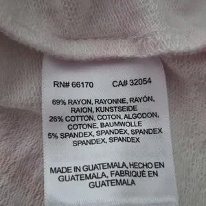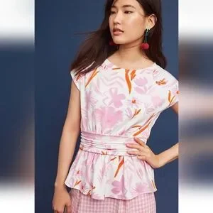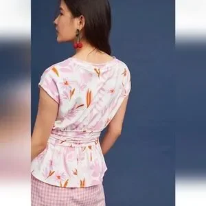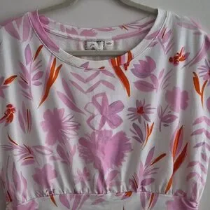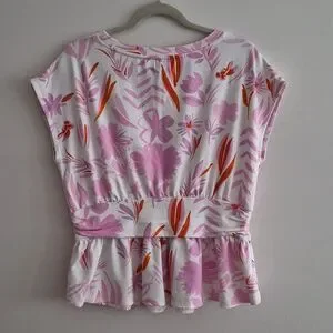 White top with orange and pink floral detail. Peplum style. The fabric feels like a very soft stretchy t-shirt material. It has rouching on the sides of the waist. Pit to pit is approximately 23.5" and length is 24". New with tags.
