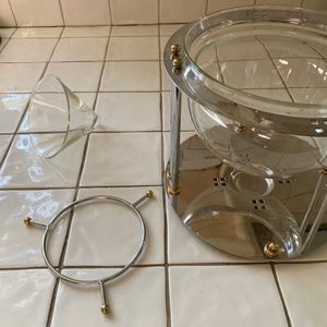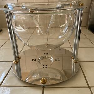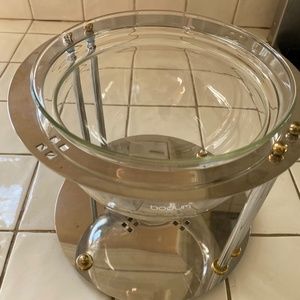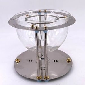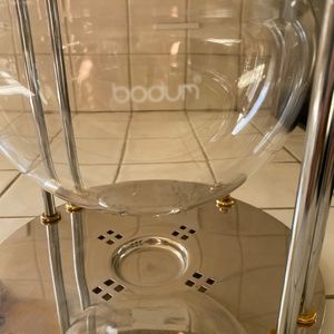 Incredible design on this rare piece by Carsten Jorgensen for Bodum, circa 1980s, stainless steel and glass with blue plastic feet and brass accents, double glass. Classic Memphis era design similar to Michael Graves style.